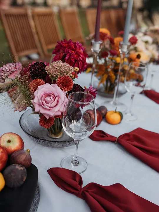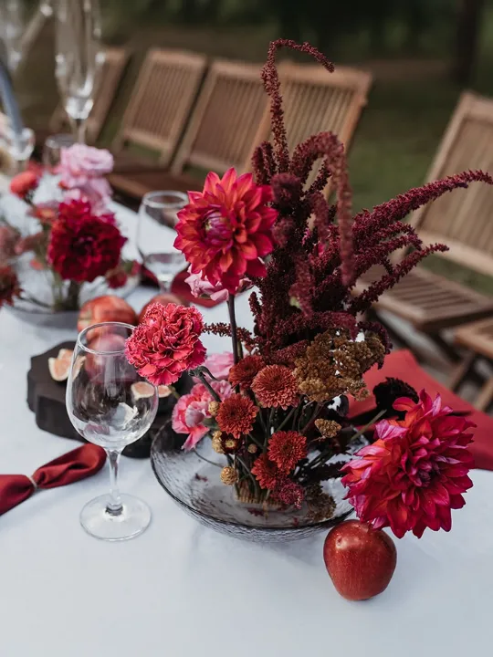 Бордовые и терракотовые акценты в оформлении напоминают о ярких осенних листьях, кружась в вихре любви.