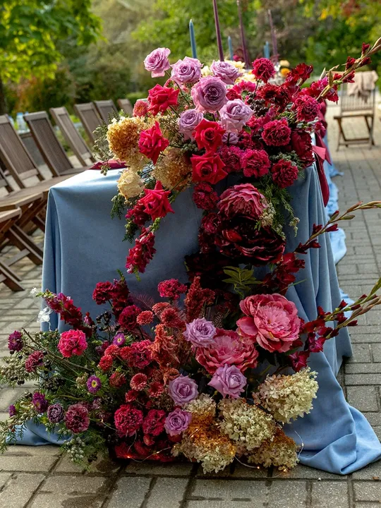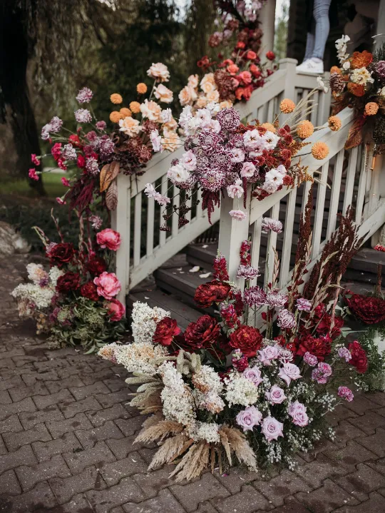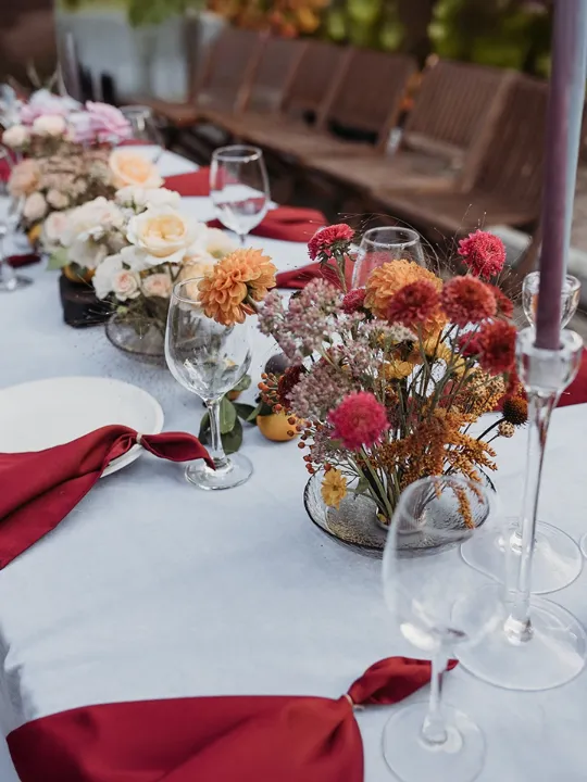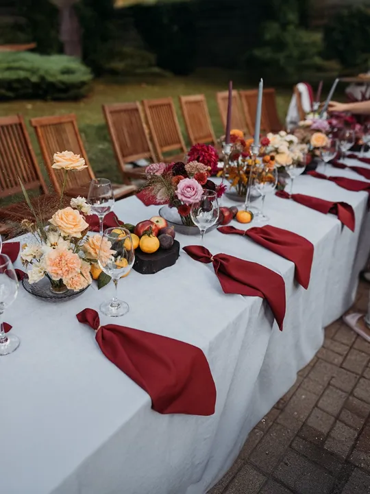 Представьте свадьбу, где осень раскрывает свою волшебную палитру – от теплых кремовых оттенков до глубоких бордовых красок.