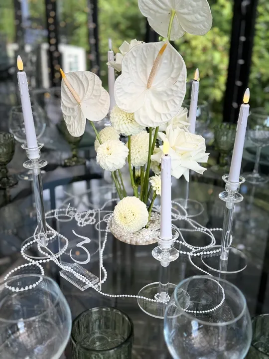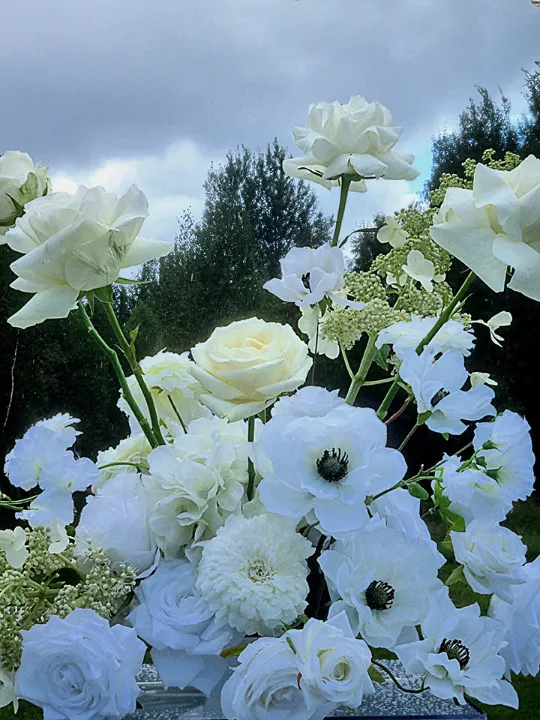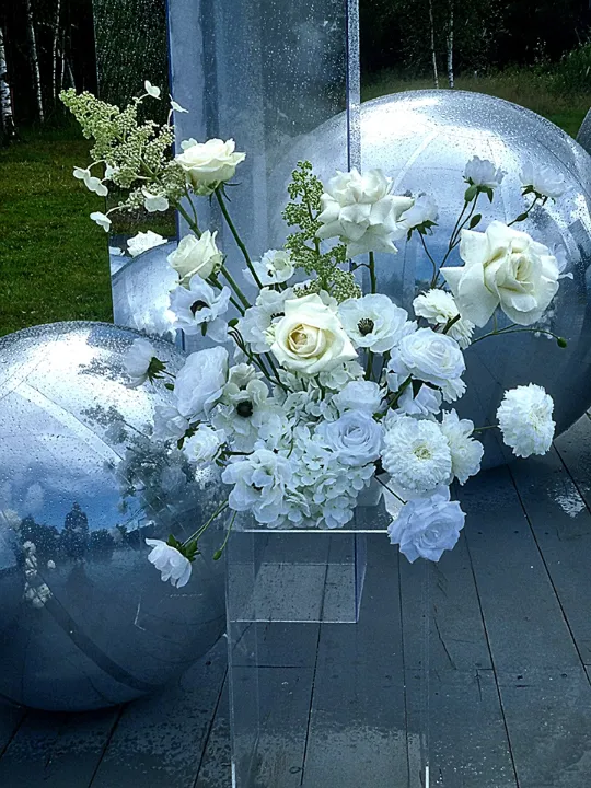 Легкие, воздушные цветочные композиции из белых роз, антуриумов и ранункулюсов словно парят в пространстве.